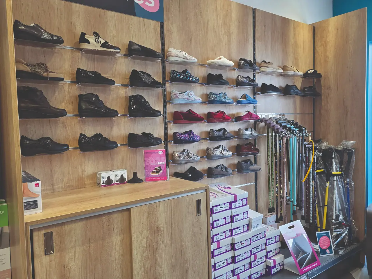 Utiliser un pédimètre permet de choisir la bonne pointure. On peut aussi utiliser le doigt pour mesurer l’espace à l’arrière de la chaussure quand le pied touche le bout de la chaussure : si on peut passer un doigt, la chaussure est à la bonne taille. Toutes les chaussures que nous vendons sont sans lacet et avec un système de fermeture réglable. Ce sont des éléments essentiels pour éviter les chutes. Nous avons des modèles pour l’été et pour l’hiver, car c’est important de bien choisir une paire adaptée à la saison.